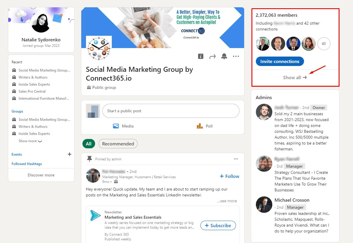Visita la página del grupo y abre la lista de sus miembros haciendo clic en el botón Ver todos: