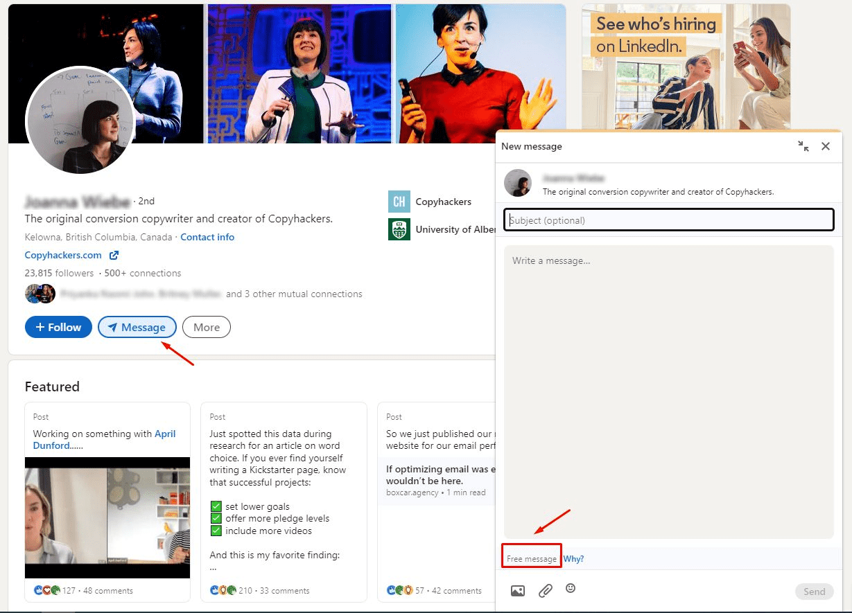 Para encontrar perfiles abiertos en un plan gratuito de LinkedIn, ve a la cuenta de LinkedIn que te interesa y busca el botón de Mensaje (puede estar oculto bajo el menú desplegable «Más», así que busca allí también). Si este perfil es abierto, aparecerá un cuadro de mensaje con las palabras «Mensaje gratuito» en la parte inferior izquierda: