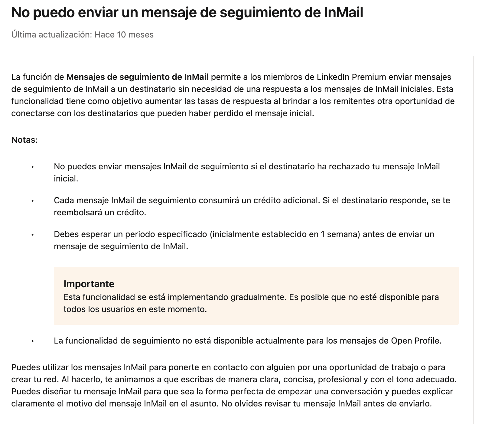 Ten en cuenta: incluso si envías un InMail a un perfil abierto de forma gratuita, no podrás enviar un seguimiento hasta que el usuario acepte y responda a tu InMail inicial: