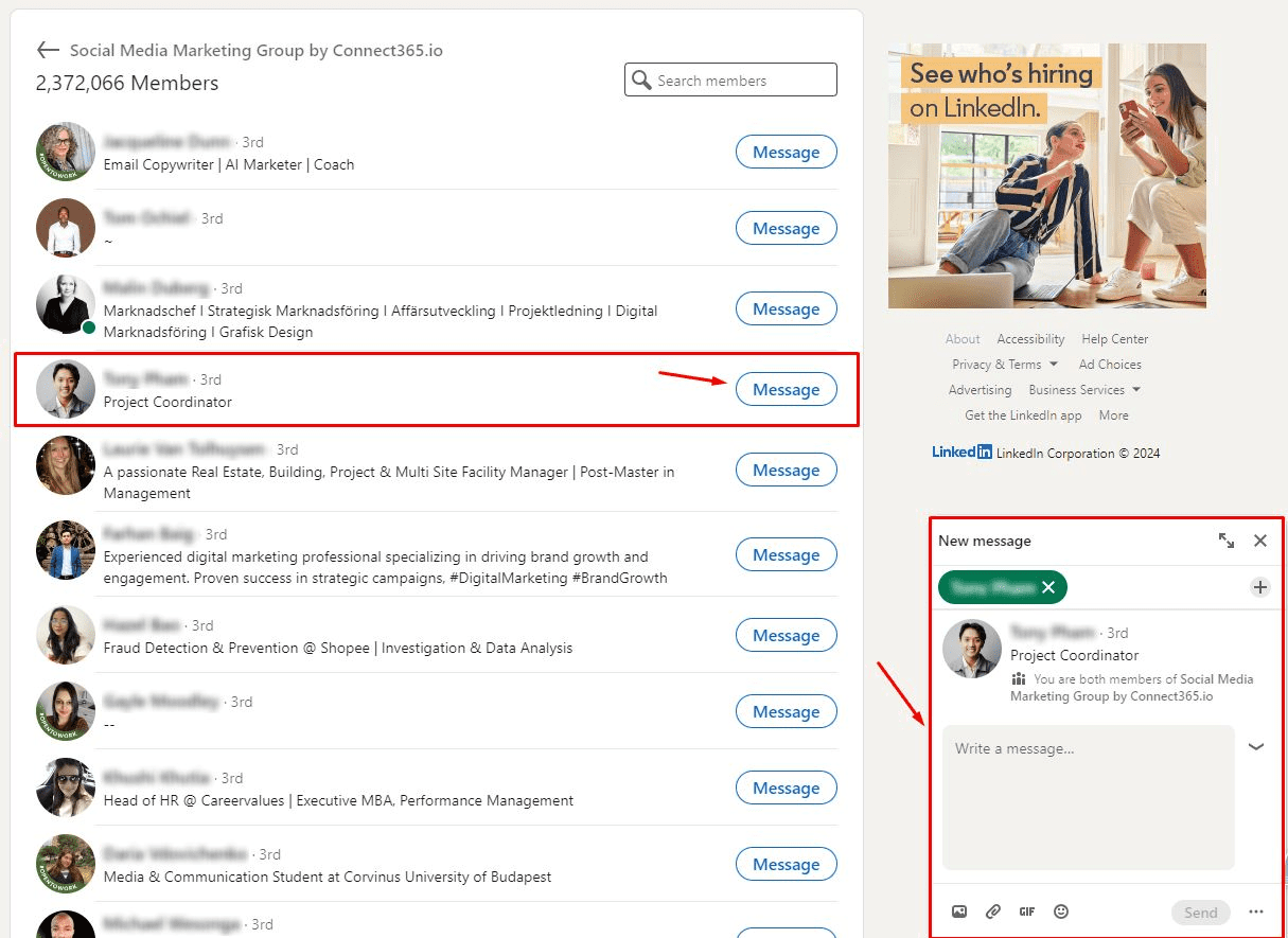 Haciendo clic en Mensaje para contactar a las personas que te interesan: