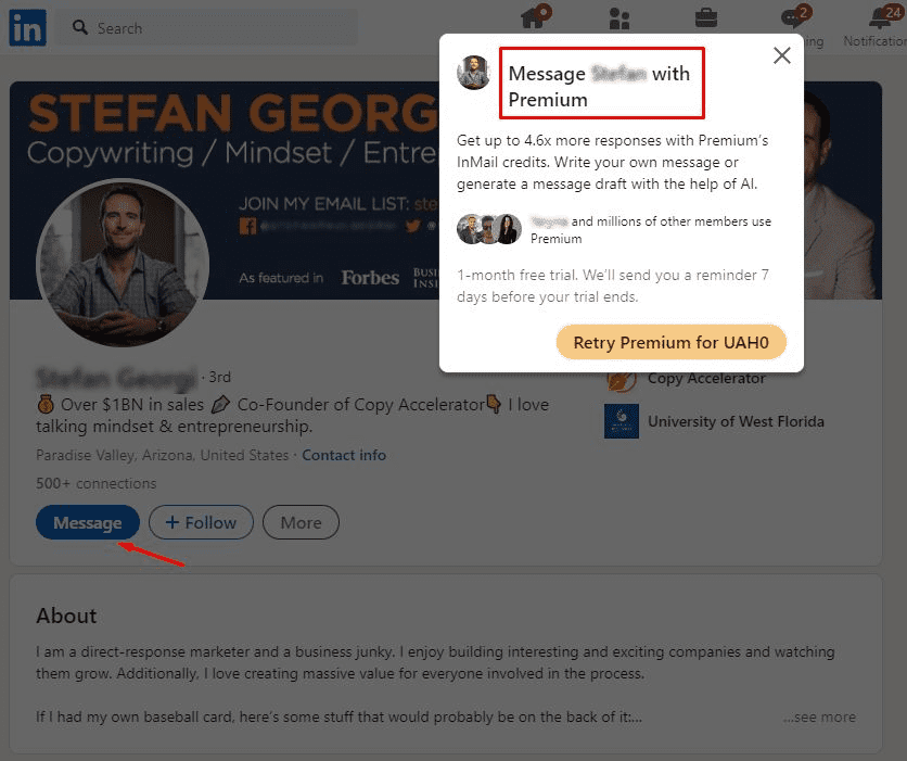 De lo contrario, LinkedIn te recomendará cambiar a un plan Premium para enviar un mensaje al usuario: