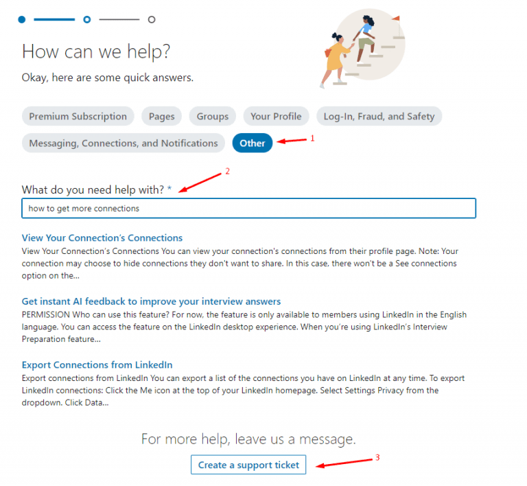 Así que, para contactarlos, ve al Centro de Ayuda de LinkedIn, elige «Otros», escribe tu consulta y haz clic en «Crear un ticket de soporte».