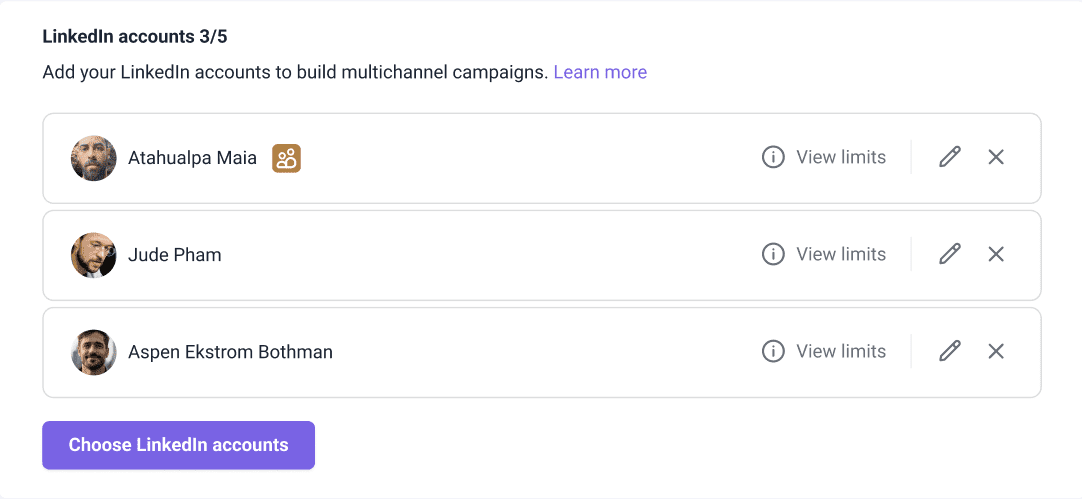 ¿Es posible aumentar el SSI automáticamente? Sí, si utilizas una solución confiable basada en la nube con un proxy dedicado y límites de seguridad inteligentes. La herramienta de automatización en LinkedIn de Snov.io te permite poner tu actividad de LinkedIn en piloto automático total. Imagina a un experto en tecnología encontrando prospectos en LinkedIn y su información de contacto, visitando perfiles y dando «me gusta» a publicaciones, todo en tu nombre. ¡También puedes desarrollar una nueva estrategia para tu alcance en LinkedIn y crear campañas de correo electrónico multicanal con visitas automáticas a perfiles, solicitudes de invitación, mensajes personalizados e InMails! Además, con Snov.io, puedes usar varias cuentas de LinkedIn para enviar invitaciones. La herramienta rotará las cuentas automáticamente, distribuyendo las invitaciones entre ellas de manera fluida para reducir el riesgo de restricciones por parte de LinkedIn: |