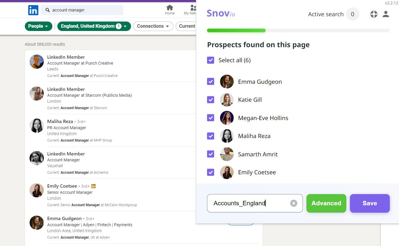 Extensión de Snov.io extrayendo prospectos desde LinkedIn para crear una lista de correos