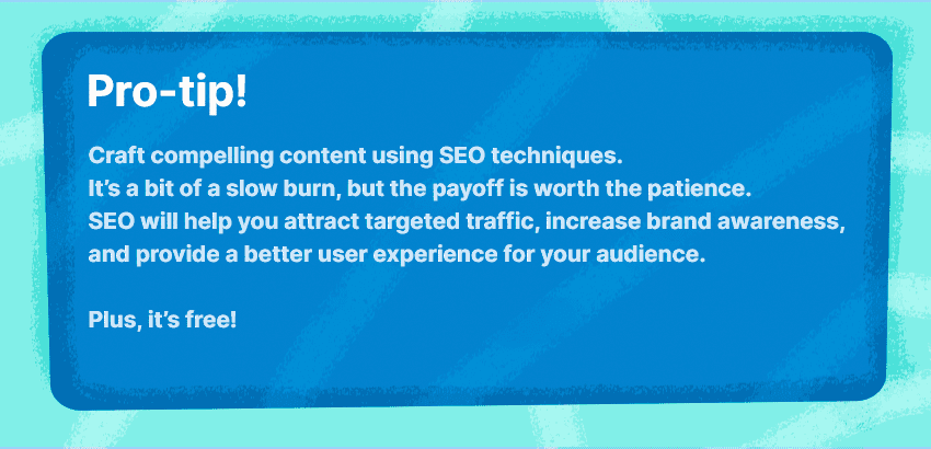 Crea contenido atractivo usando técnicas de SEO. Es un proceso algo lento, pero la recompensa vale la paciencia. El SEO te ayudará a atraer tráfico segmentado, aumentar el reconocimiento de tu marca y brindar una mejor experiencia de usuario a tu audiencia.
