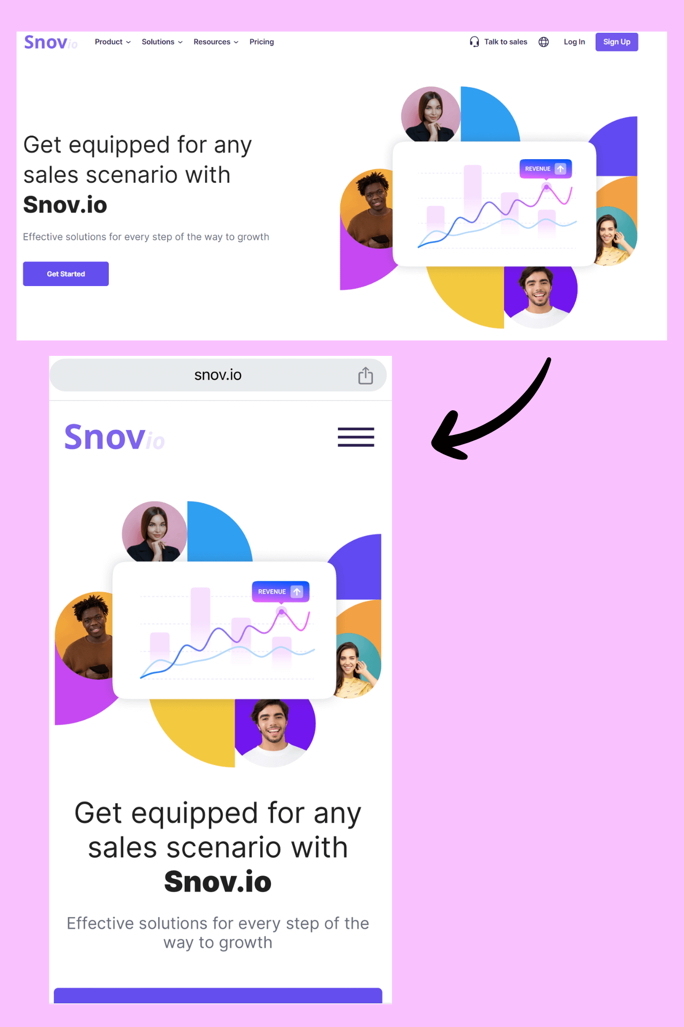 Vista de Snov.io en versión escritorio y móvil mostrando diseño adaptable (mobile-friendly)