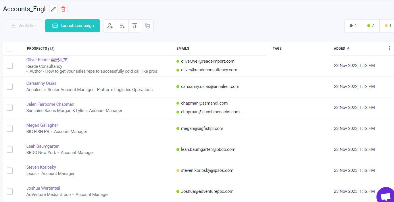 • Enriquecimiento de contactos: Puedes añadir más de 50 datos adicionales, como números de teléfono, enlaces a redes sociales y más, a tus listas de prospectos. Esto te ayudará a conocer mejor a tus potenciales clientes y personalizar tus campañas de email.