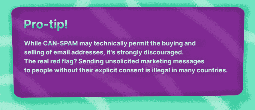 Aunque la ley CAN-SPAM técnicamente permite la compra y venta de direcciones de correo electrónico, se desaconseja encarecidamente. ¿La verdadera señal de alarma? Enviar mensajes de marketing no solicitados a personas sin su consentimiento explícito es ilegal en muchos países.