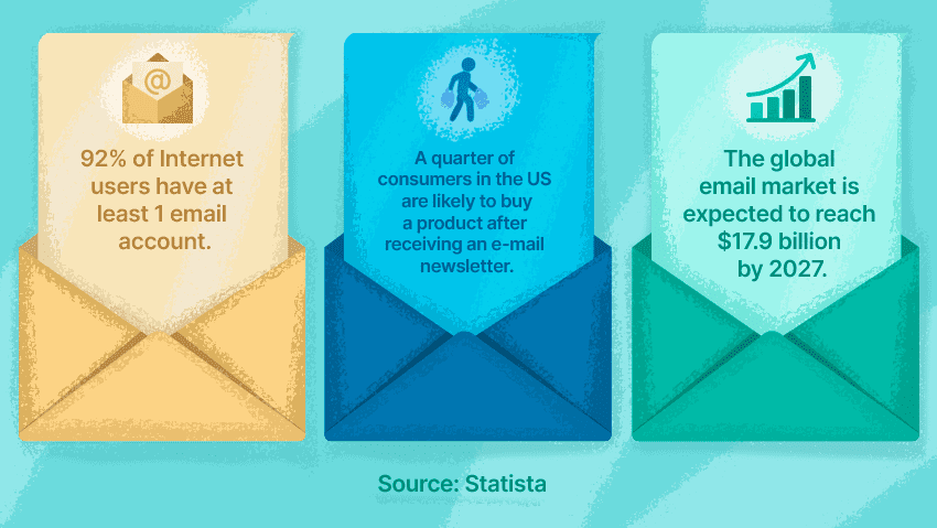 Según Statista: 92 % de los usuarios de Internet tienen al menos una cuenta de correo electrónico; una cuarta parte de los consumidores en EE. UU. tiende a comprar un producto tras recibir un boletín por email; y se espera que el mercado global de email alcance los 17 900 millones USD para 2027.