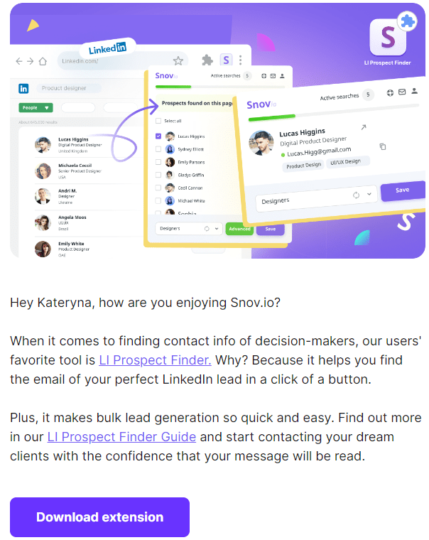 Hola Kateryna, ¿estás disfrutando Snov.io? Cuando se trata de encontrar la información de contacto de los tomadores de decisión, la herramienta favorita de nuestros usuarios es Localizador de Clientes Potenciales. ¿Por qué? Porque te ayuda a encontrar el correo electrónico de tu lead ideal en LinkedIn con solo un clic. Además, hace que la generación masiva de leads sea rápida y sencilla. Descubre más en nuestra Guía de Localizador de Clientes Potenciales y comienza a contactar a tus clientes ideales con la confianza de que tu mensaje será leído.