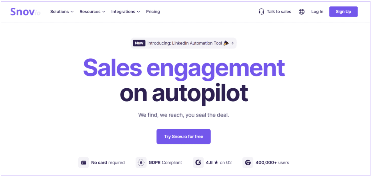 Tanto si buscas escalar tu negocio como perfeccionar tu estrategia de prospección, Snov.io es tu mejor opción. Además, su CRM intuitivo se integra con más de 5.000 aplicaciones, mejorando la automatización de ventas y la productividad.