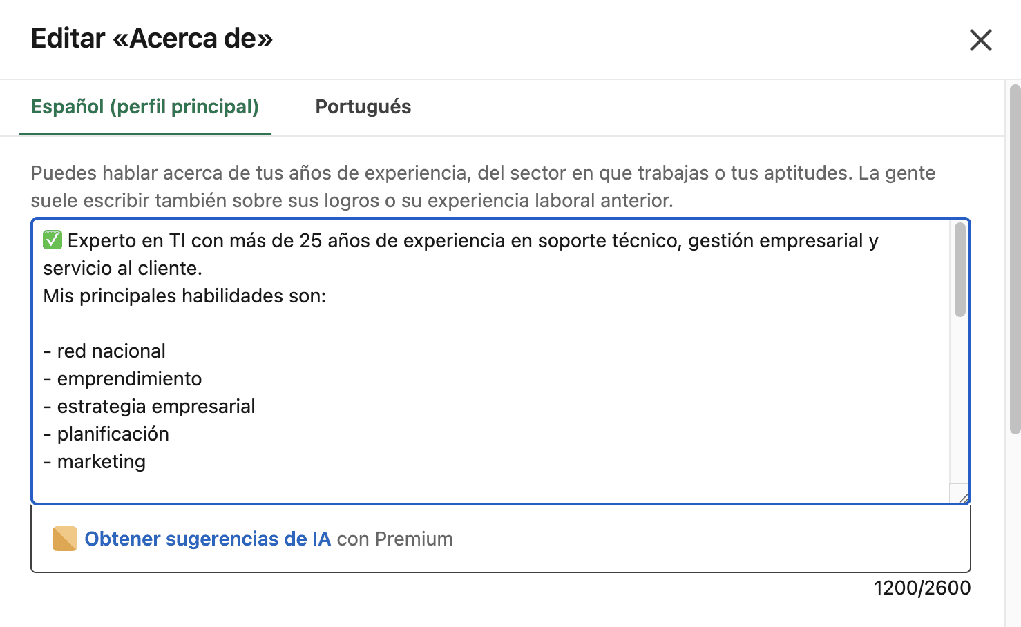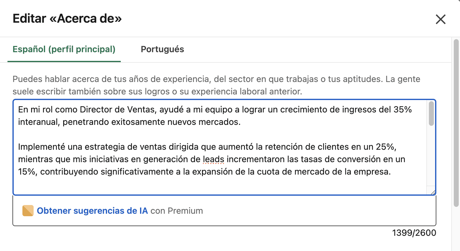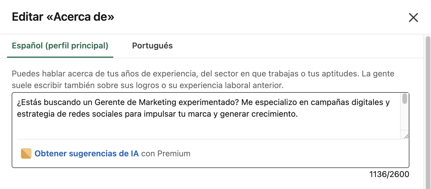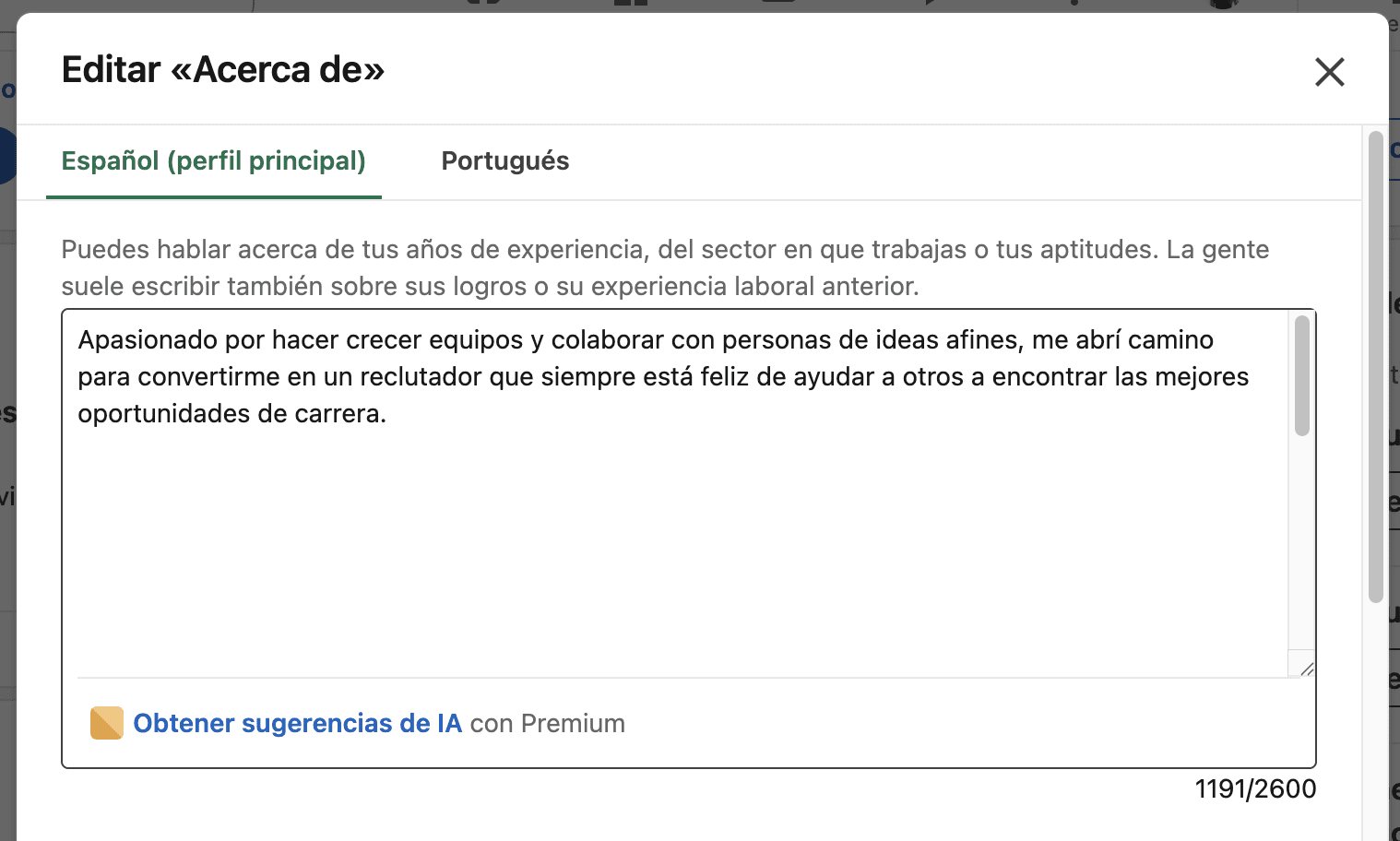 Usar “yo” ayuda a establecer una conexión directa con el lector, haciendo que tu perfil parezca más una conversación que un documento formal. Este estilo es efectivo para humanizar tu historia profesional.