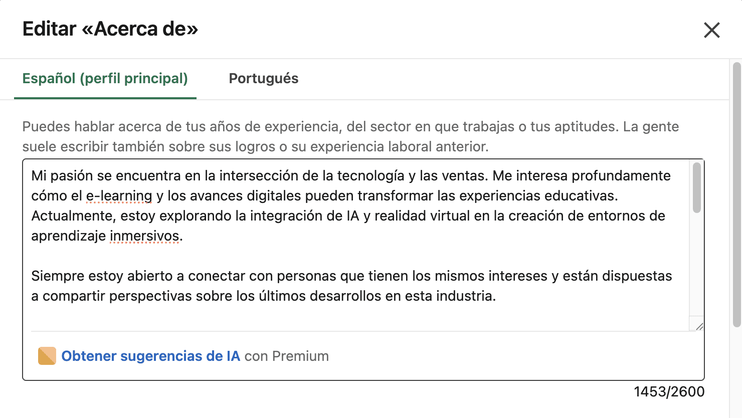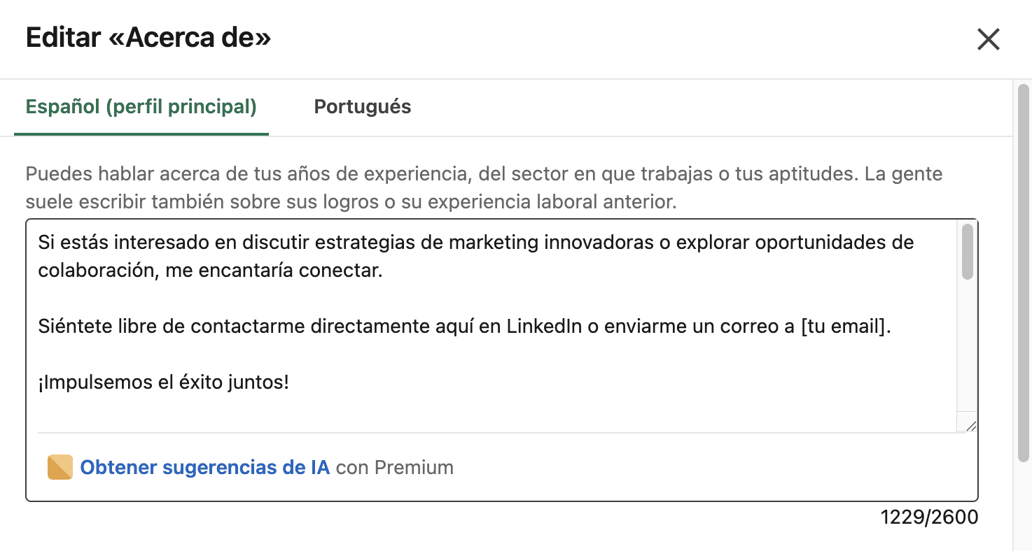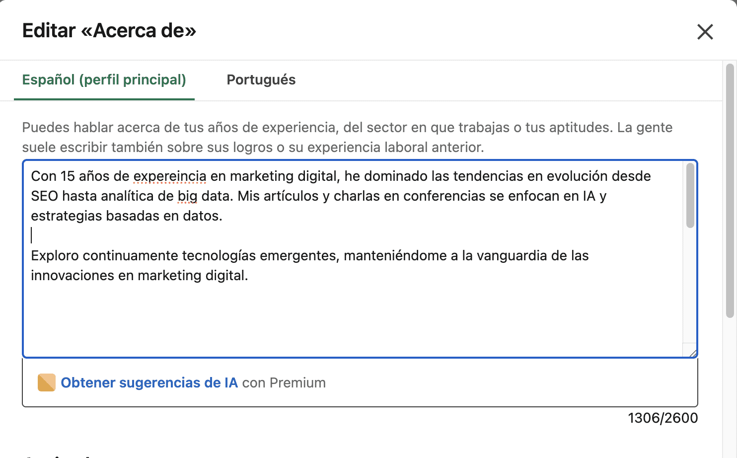 Usar “yo” ayuda a establecer una conexión directa con el lector, haciendo que tu perfil parezca más una conversación que un documento formal. Este estilo es efectivo para humanizar tu historia profesional.