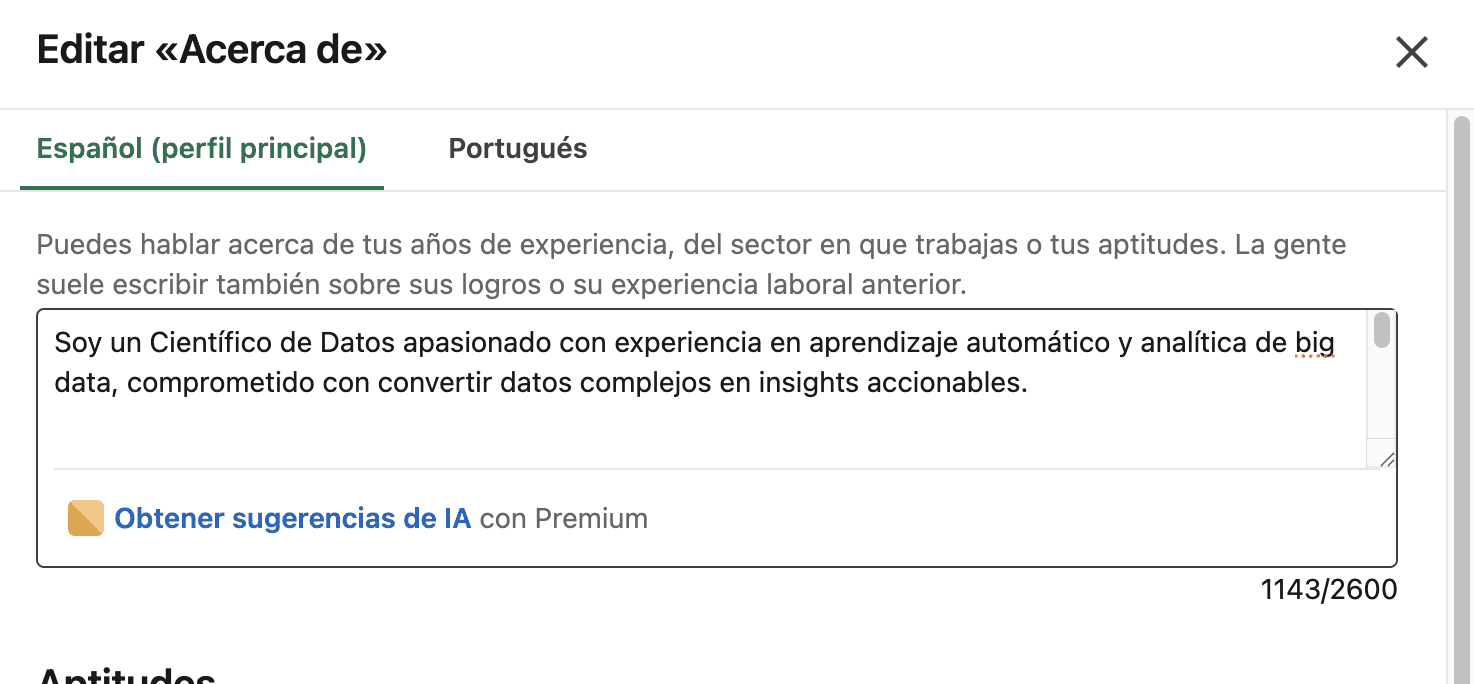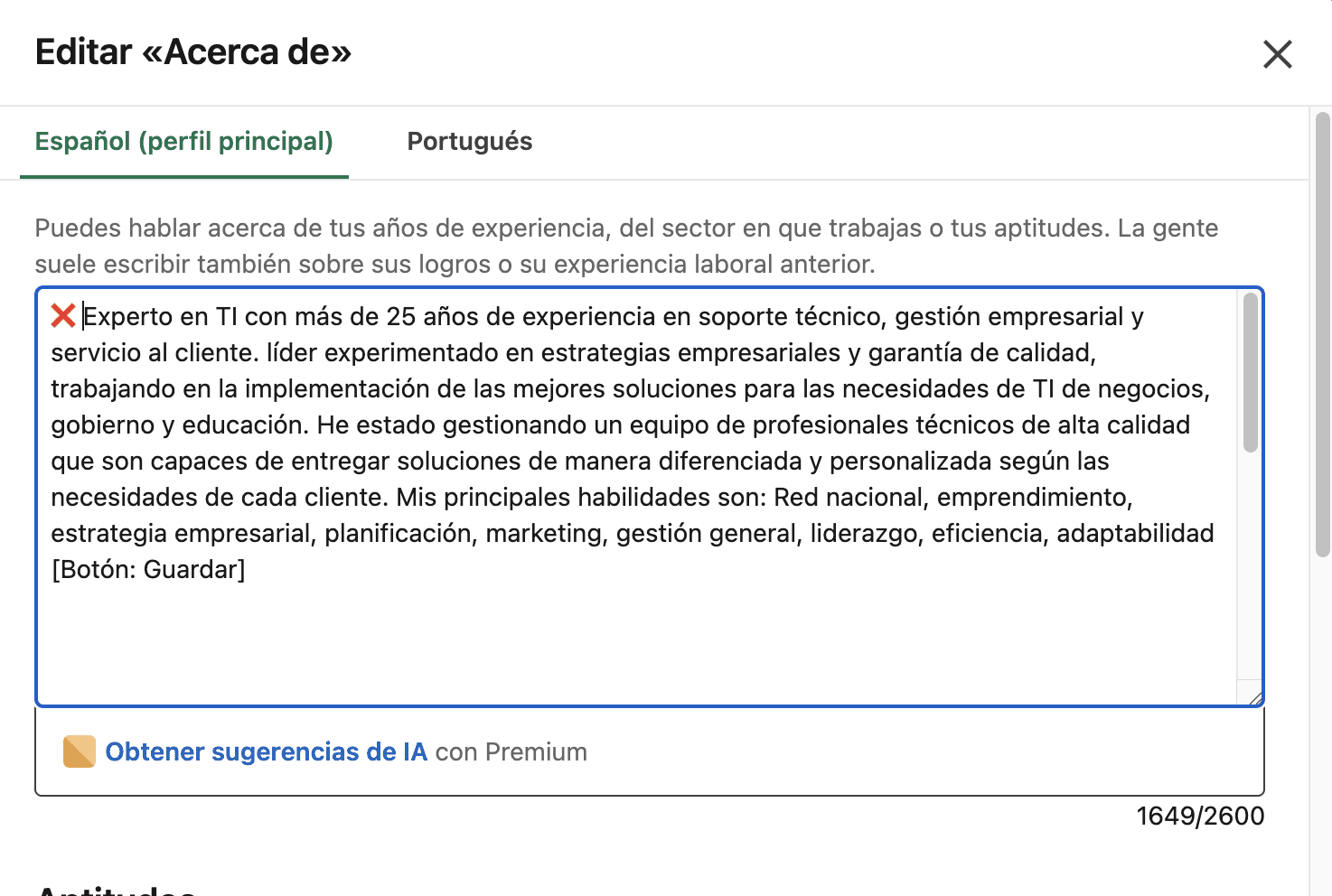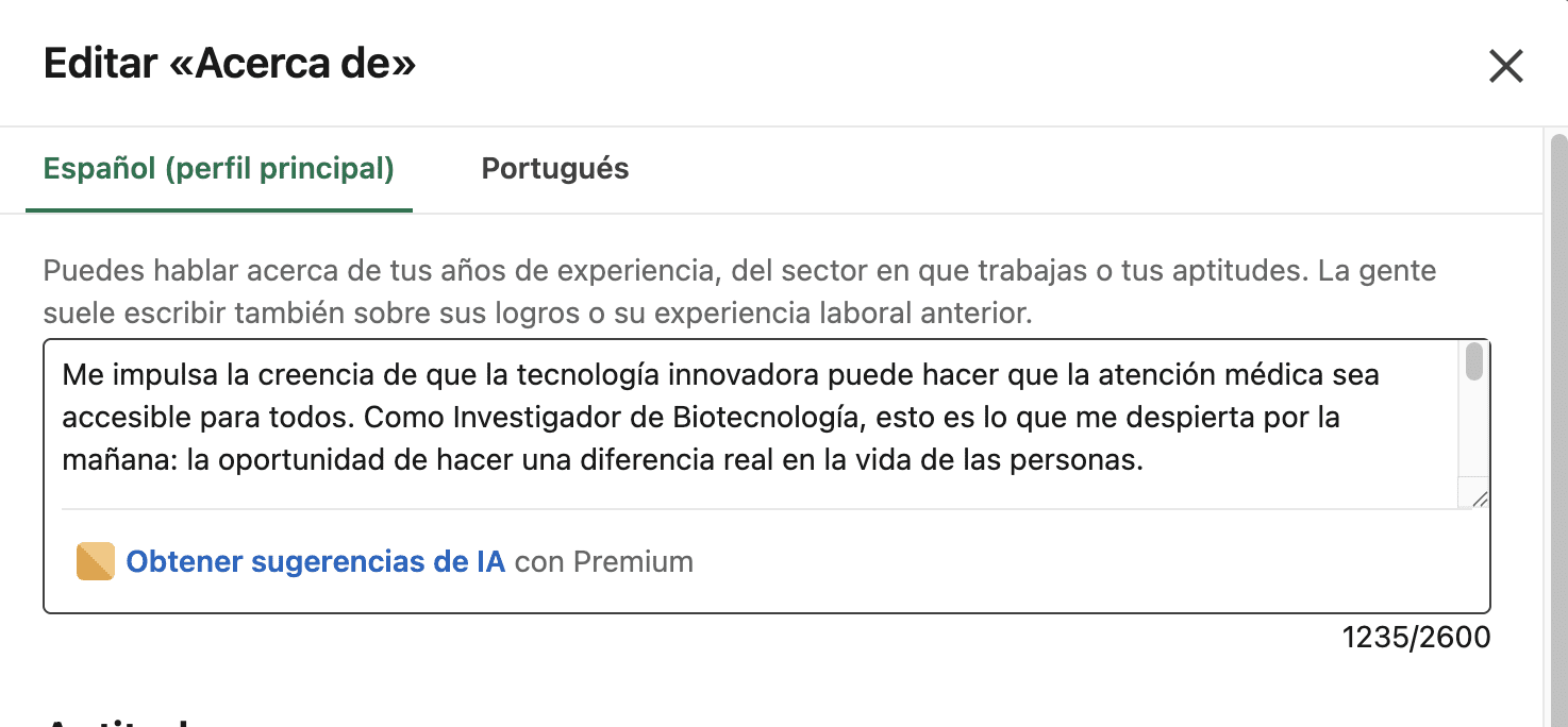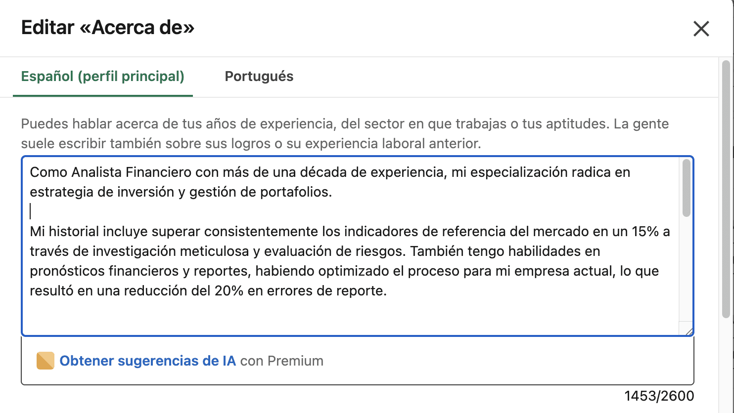 Usar “yo” ayuda a establecer una conexión directa con el lector, haciendo que tu perfil parezca más una conversación que un documento formal. Este estilo es efectivo para humanizar tu historia profesional.