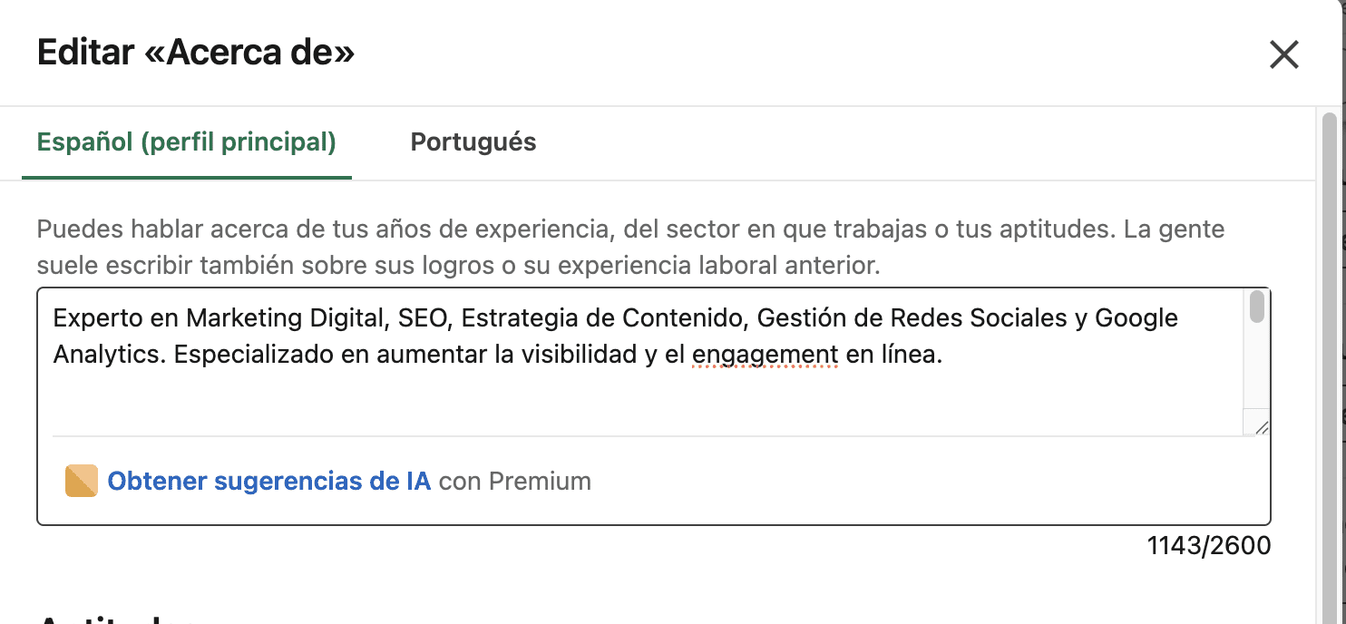Incorpora palabras clave de SEO relevantes para tu industria y función. Esto aumenta la visibilidad de tu perfil de LinkedIn en los resultados de búsqueda, conectándote con las oportunidades y redes correctas. Elige palabras clave que los posibles empleadores o colaboradores probablemente usarán al buscar profesionales en tu área.