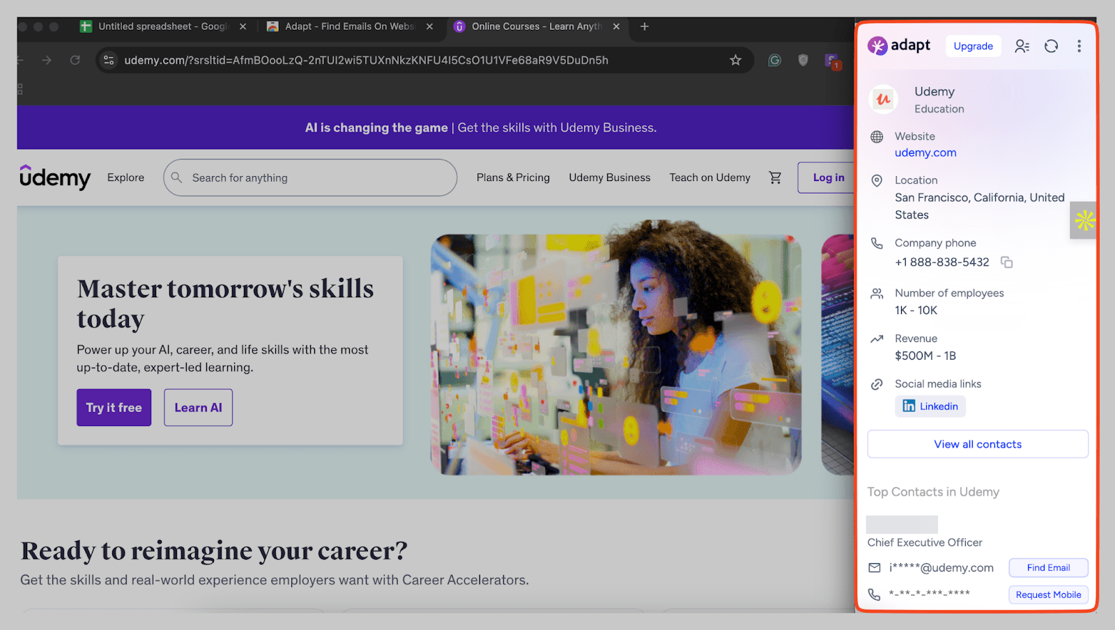 - Integración con LinkedIn: Extrae contactos directamente de los perfiles de LinkedIn al hacer clic en el icono de Adapt en la barra de direcciones de Chrome.