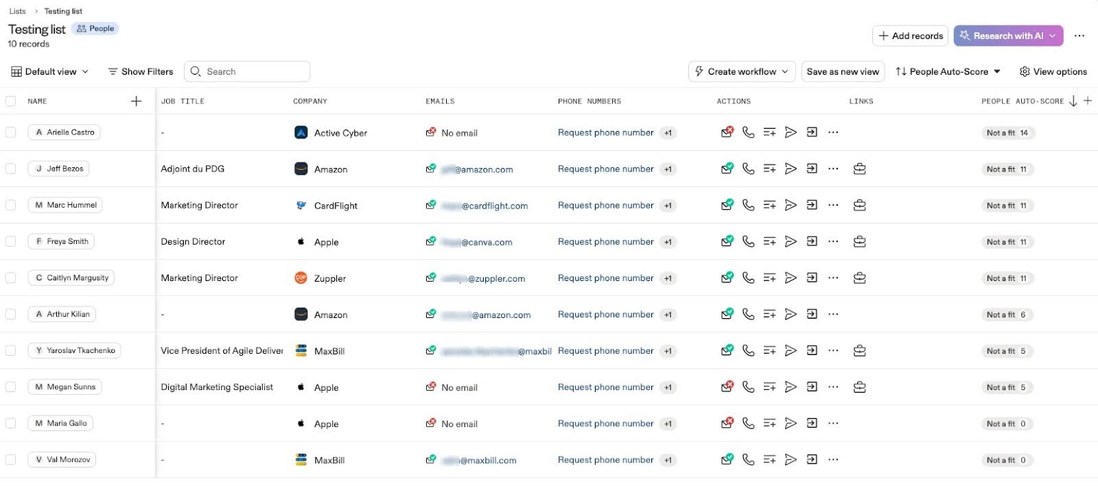 - Búsqueda con IA: Encuentra datos de prospectos, incluyendo direcciones de correo electrónico, basándose en tus instrucciones (prompts).
