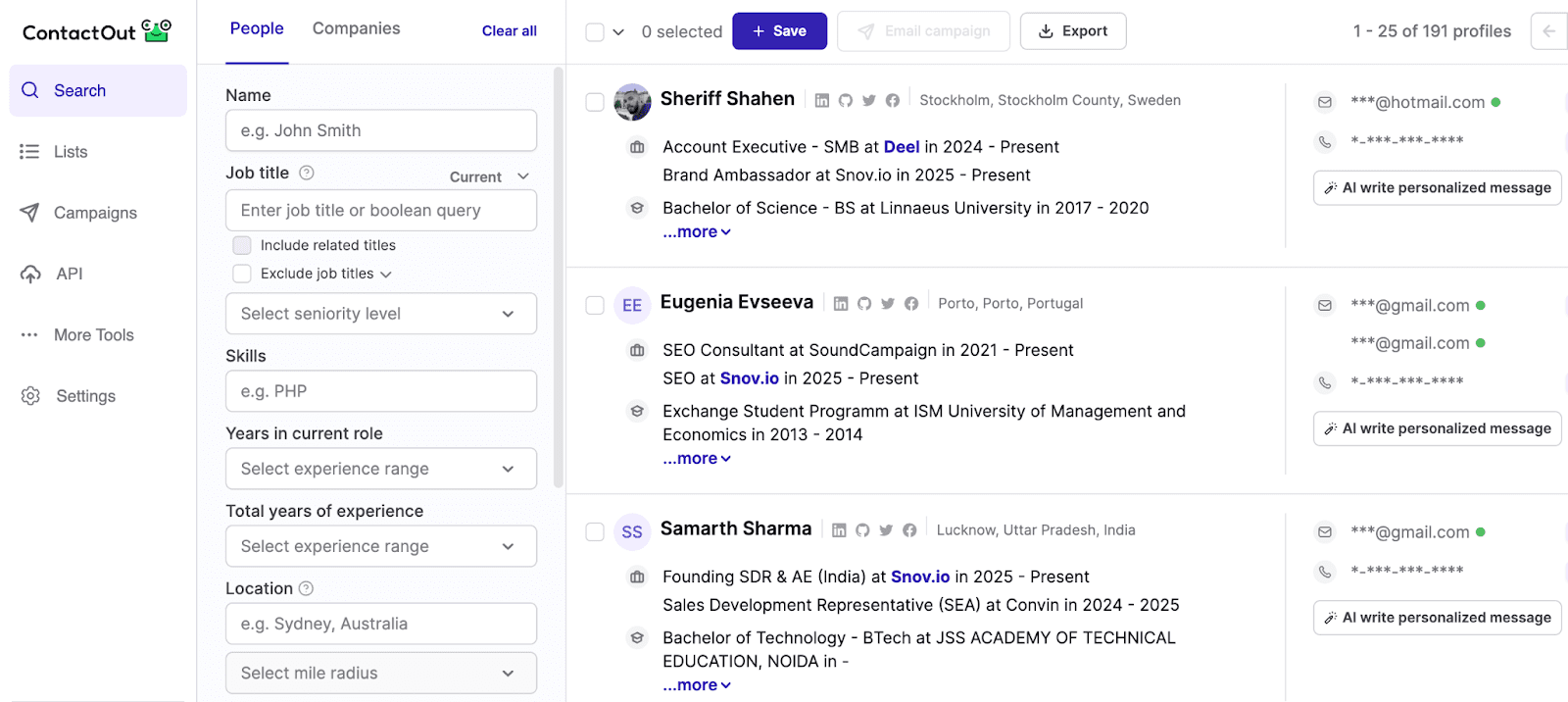 ContactOut es una buena solución si necesitas un extractor de correos sencillo con funciones de prospección básicas. Solo ten en cuenta: según nuestra prueba, esta herramienta extrae datos principalmente de perfiles de LinkedIn. Por lo tanto, si buscas el correo de una persona en la base de datos de ContactOut pero no está vinculado a ningún perfil de LinkedIn, lo más probable es que la herramienta no logre extraerlo.