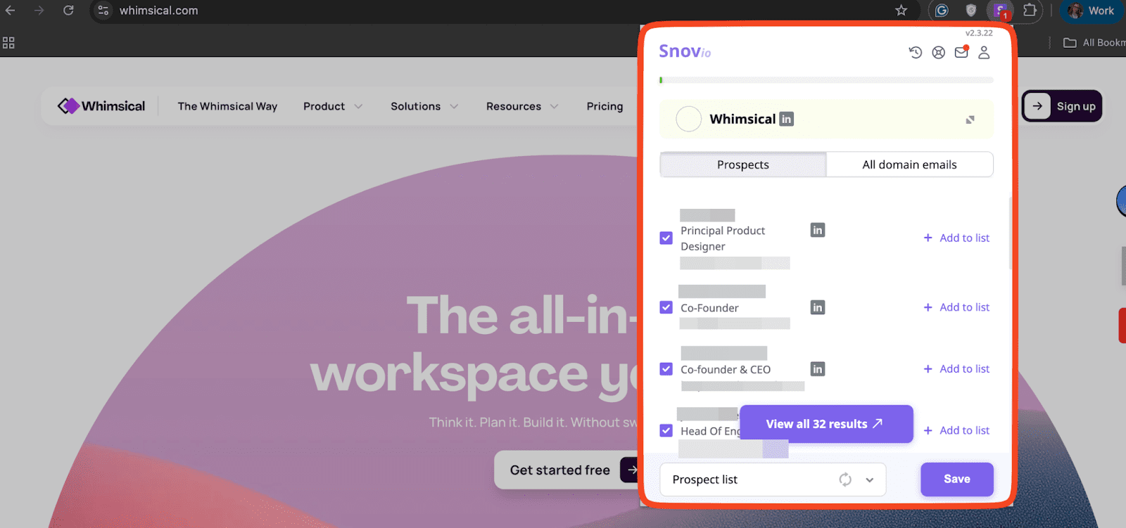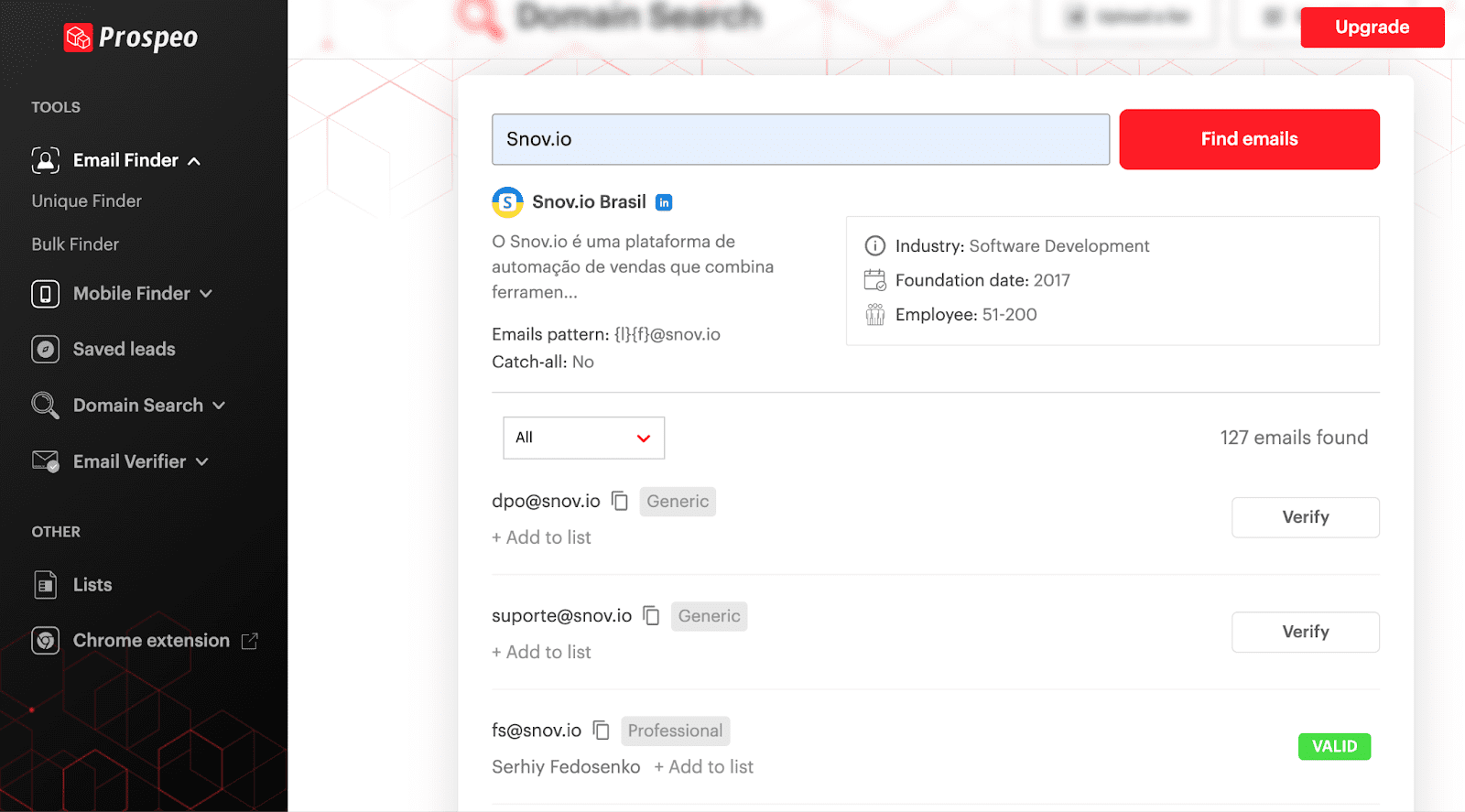Por ejemplo, con la función de Búsqueda de Dominios de Snov.io, puedes buscar dominios específicos y luego extraer los prospectos que pertenecen a esa empresa.