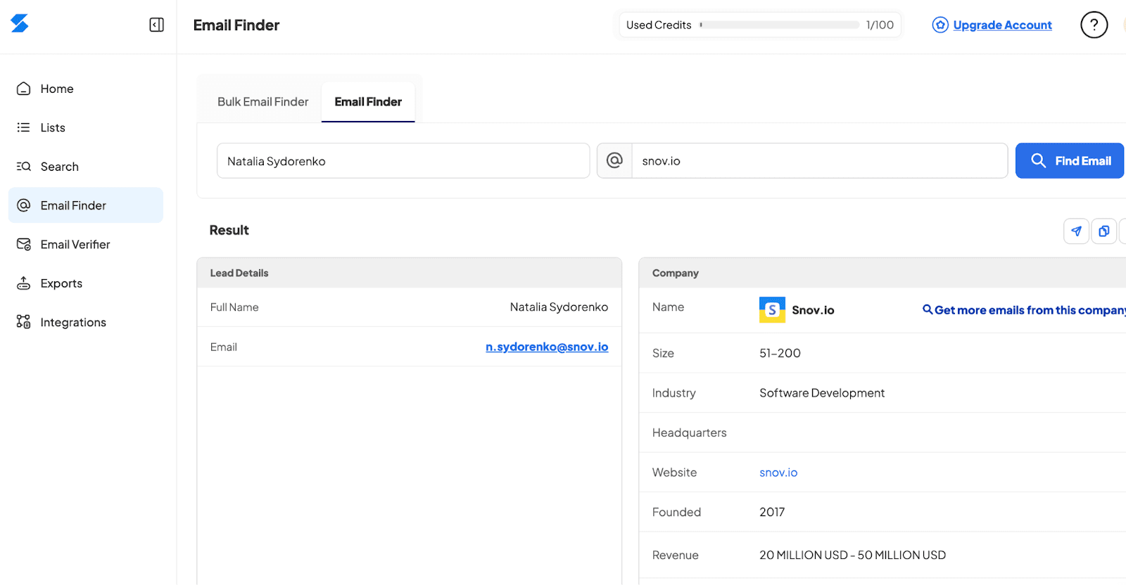 - Búsqueda de leads con IA (próximamente): Snov.io está por lanzar su búsqueda de prospectos impulsada por IA, ayudándote a encontrar cualquier contacto basado en tus instrucciones.
