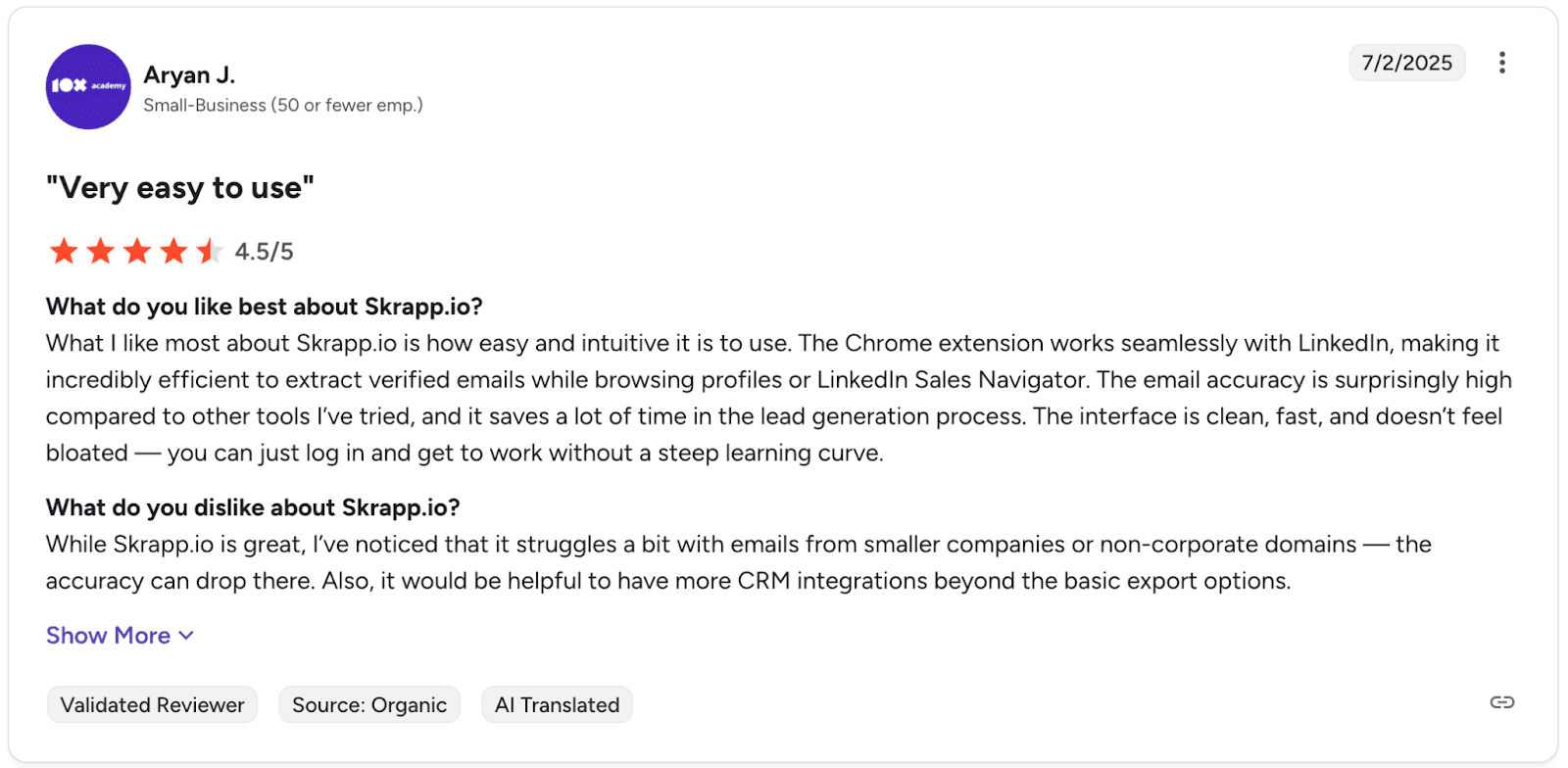 La mayoría de los clientes destaca lo fácil que es usar esta herramienta. No obstante, los usuarios coinciden conmigo en que la precisión de los correos electrónicos a veces puede dejar mucho que desear.
