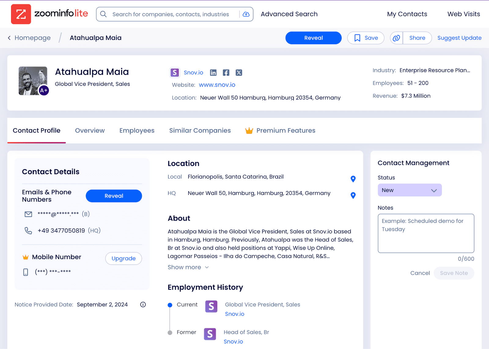 - Información de la empresa: Proporciona información a nivel de empresa, incluyendo industria, sede central y número de empleados.