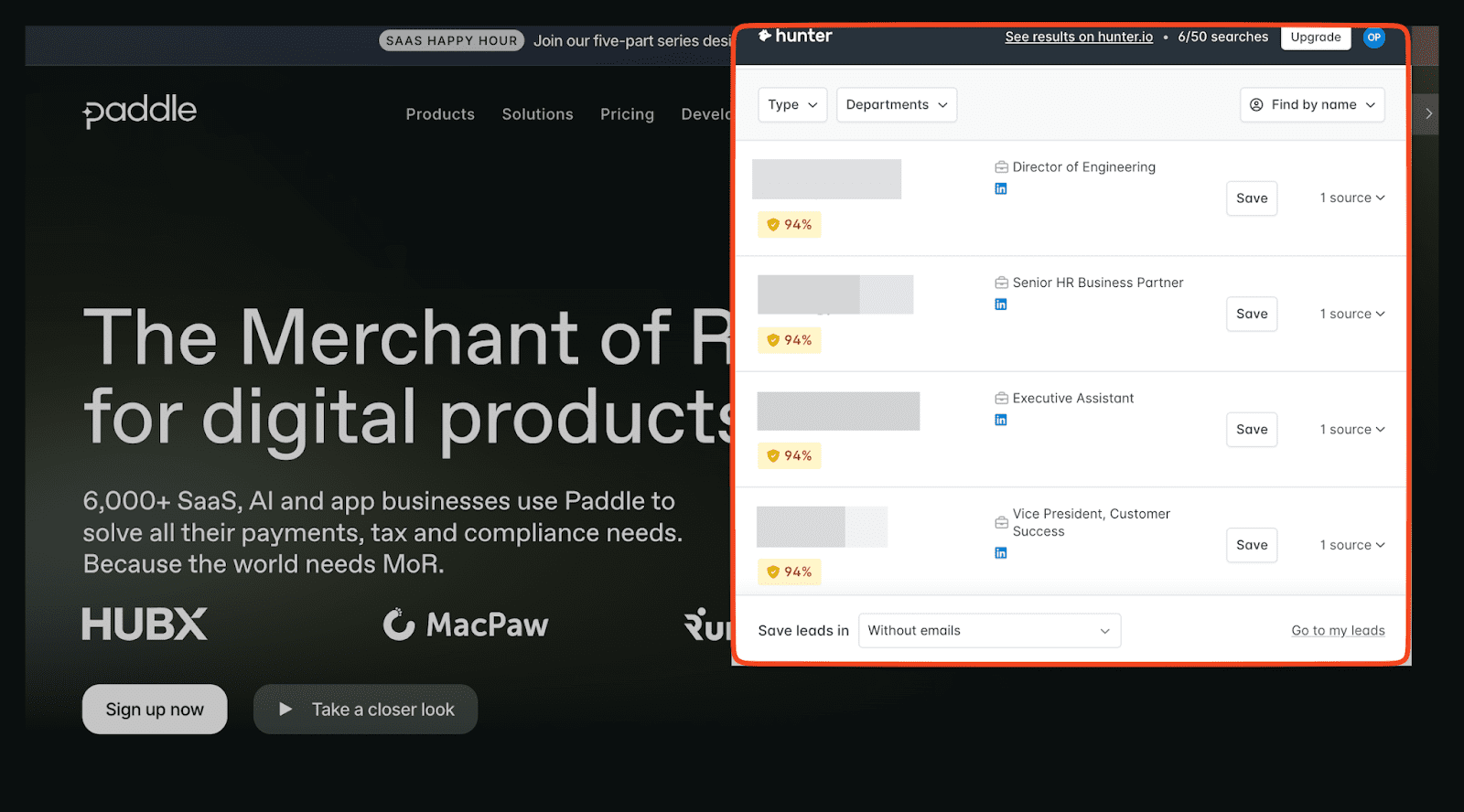 Skrapp es amado por su extensión de Chrome para extraer correos electrónicos, la cual funciona en LinkedIn y sitios web de empresas. Pero muestra solo detalles básicos (nombres, cargos, etc.) en la extensión misma. Para acceder a los correos reales, debes ir a su aplicación principal. A pesar de esto, Skrapp.io genera un volumen sólido de prospectos, convirtiéndolo en el mejor extractor de correos para construir listas de contactos de tamaño considerable.