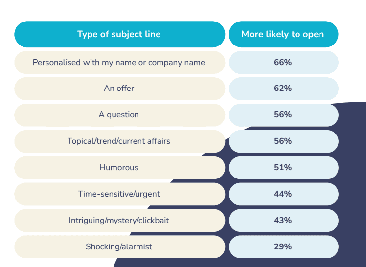 According to the Email Statistics Report for 2025 by ZeroBounce, 43% of people open their emails if it has a catchy subject line.