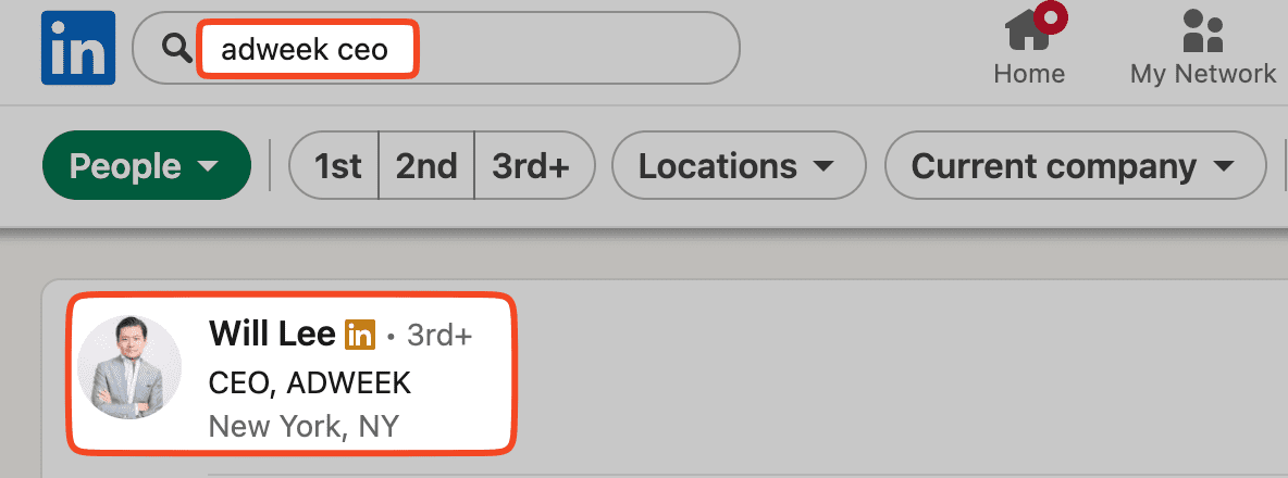 But the page existed, so I thought that searching on LinkedIn would yield results. I simply entered ‘Adweek CEO’ and quickly found him – Will Lee: