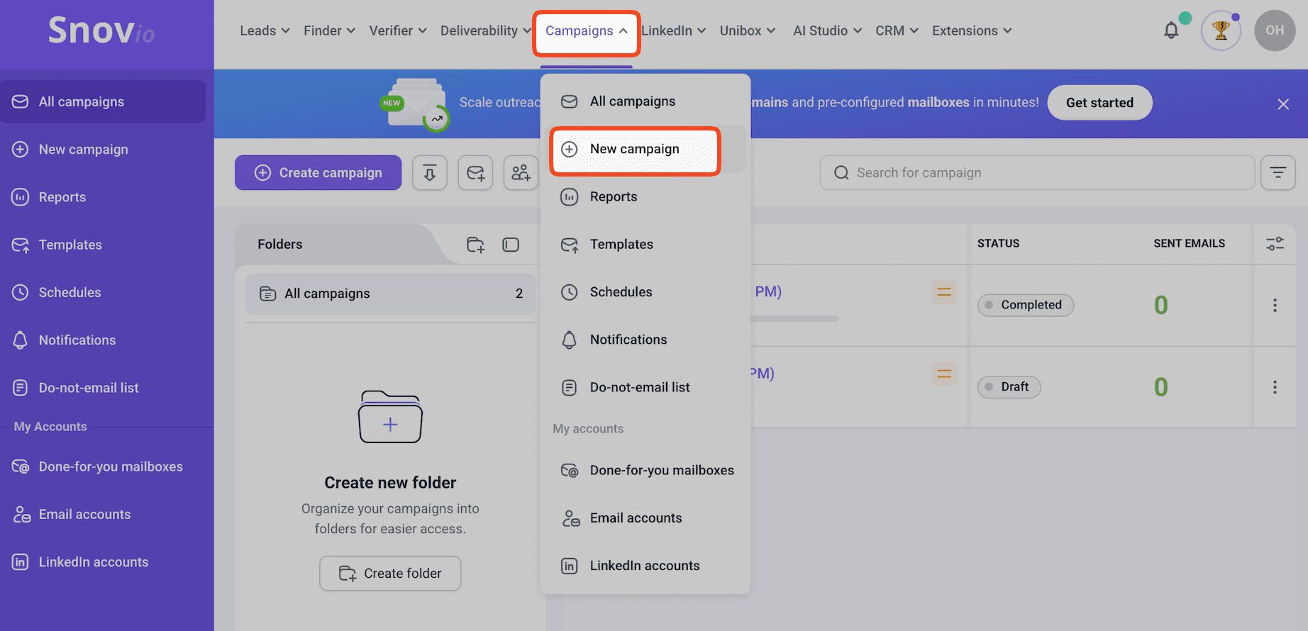 Log into Snov.io, go to ‘Campaigns,’ and click “New campaign.”