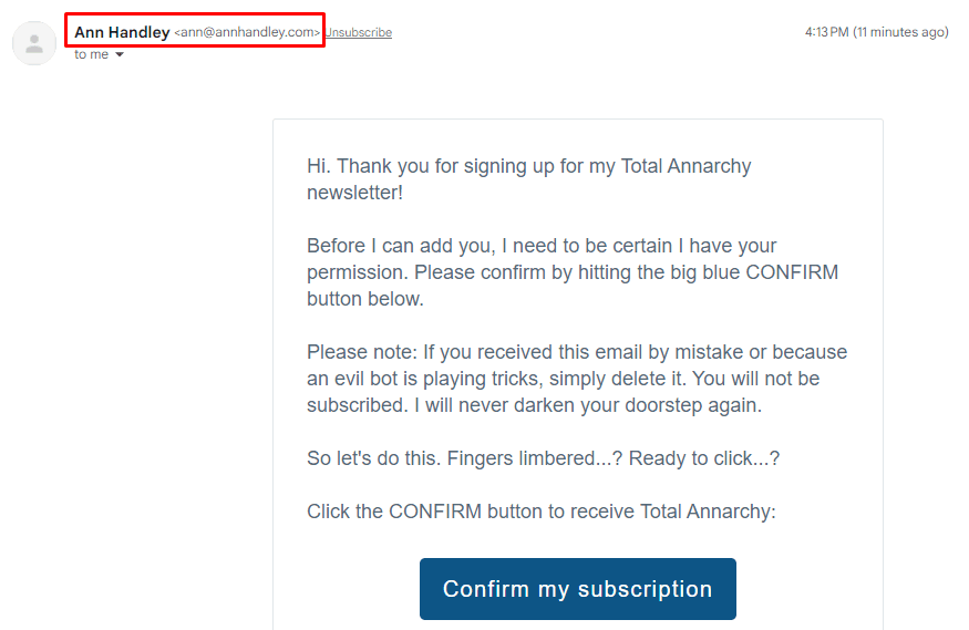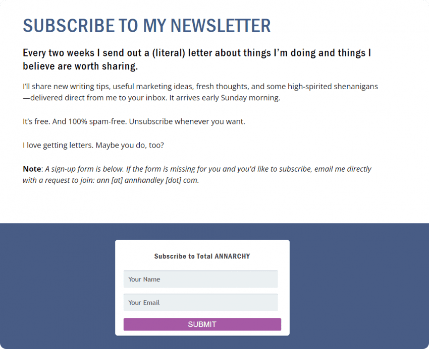 As soon as I visited Ann Handley’s blog page, I found the Newsletter button, which logically led me straight to the subscription page: