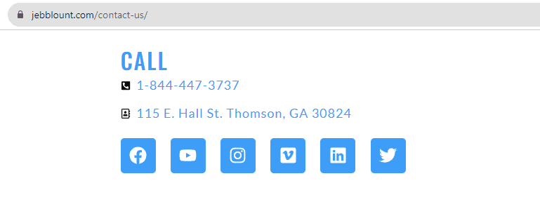 On Jeb Blount’s site (he’s a respected sales thought leader), I quickly found the Contact Us section. It had his phone number and social links.
