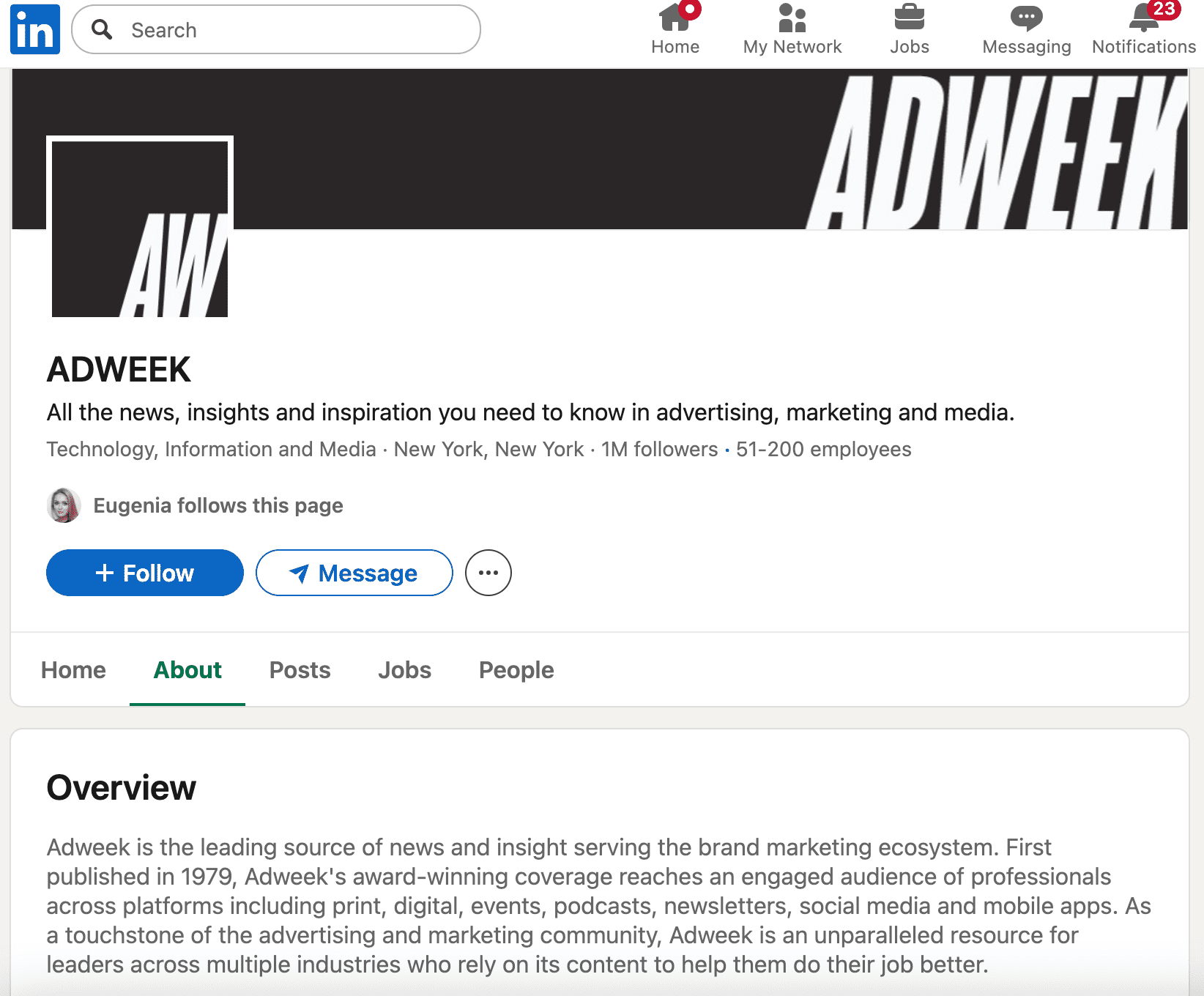 Sometimes social links go to company pages instead. That happened with Adweek magazine.