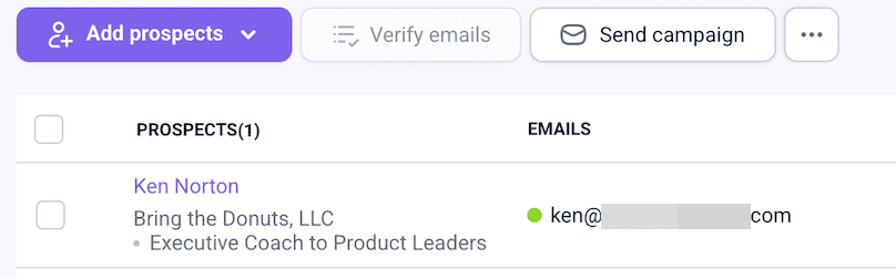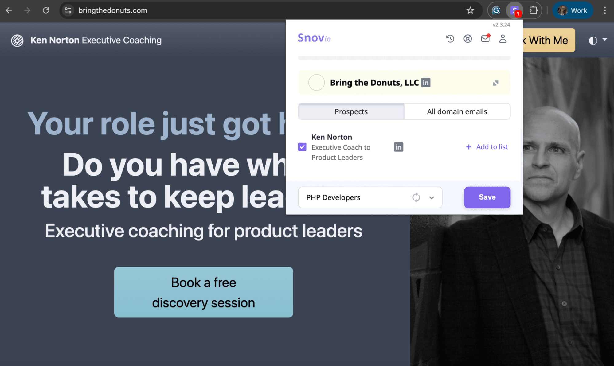 I tried this on bringthedonuts.com, which is Ken Norton’s coaching site for product managers. Once I clicked the extension icon and opened the ‘Prospects’ tab, the founder’s info appeared right away.