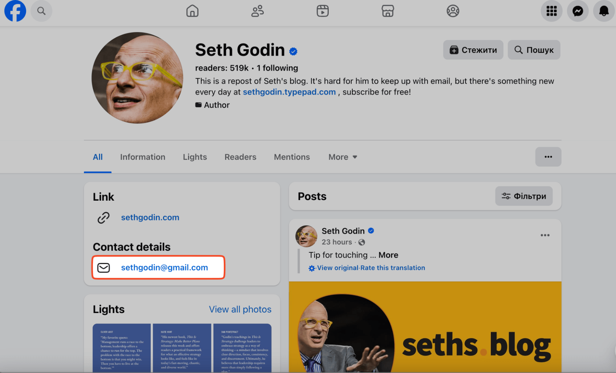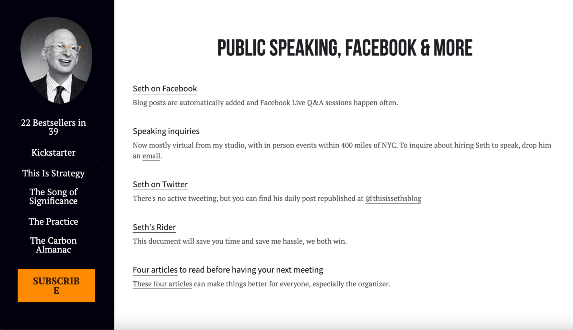 I checked out Seth Godin’s blog, but couldn’t find direct contact info. Just links to his social accounts.