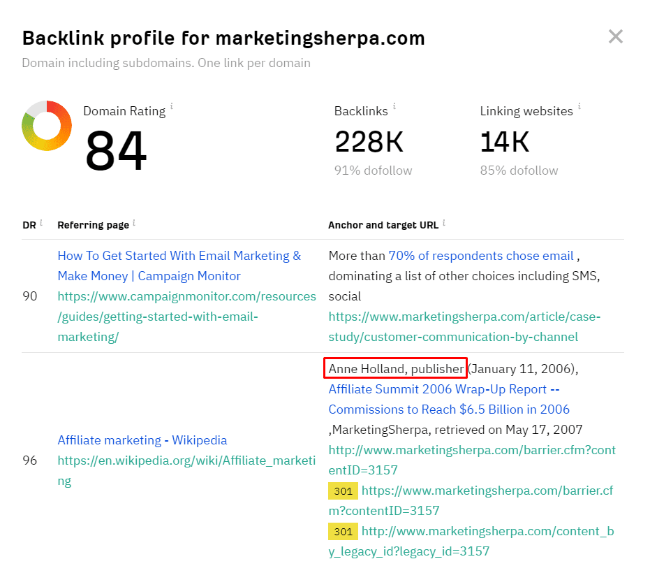 Magic trick? Backlink analysis. Such analyses showcase websites linking back to target sites. Sometimes, these linking websites might include information about the target site’s publisher.