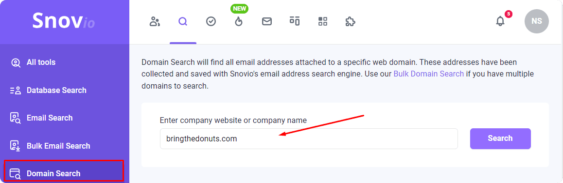 If you’re more of an app person, locate Snov.io’s Domain Search feature. Put the domain name in the field and get the company info with all linked email addresses right away.