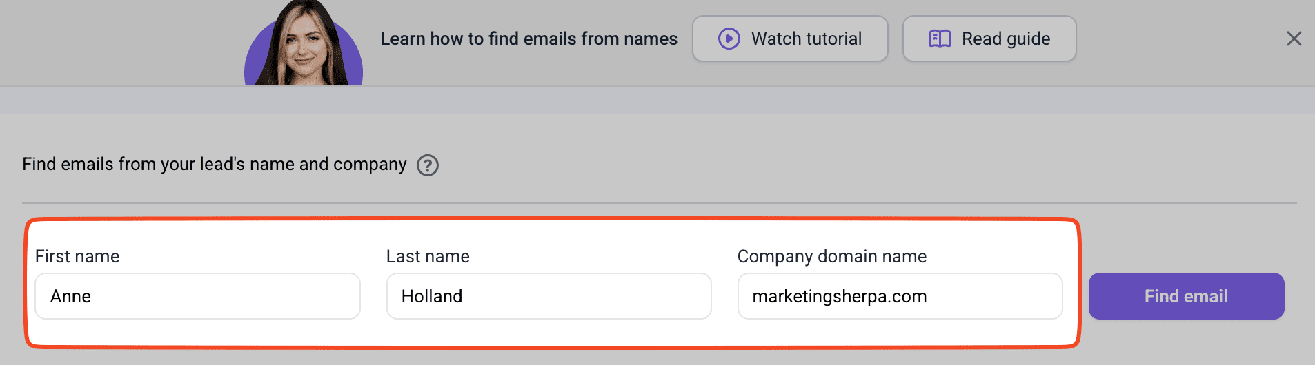 Once I had the name (Anne Holland), I used Snov.io Single Email Search. Just dropped in the first name, last name, and domain: