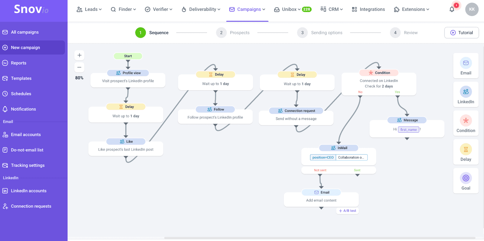 The best part? Setting up such a sequence takes only a couple of minutes when using the Snov.io Multichannel Outreach Tool.