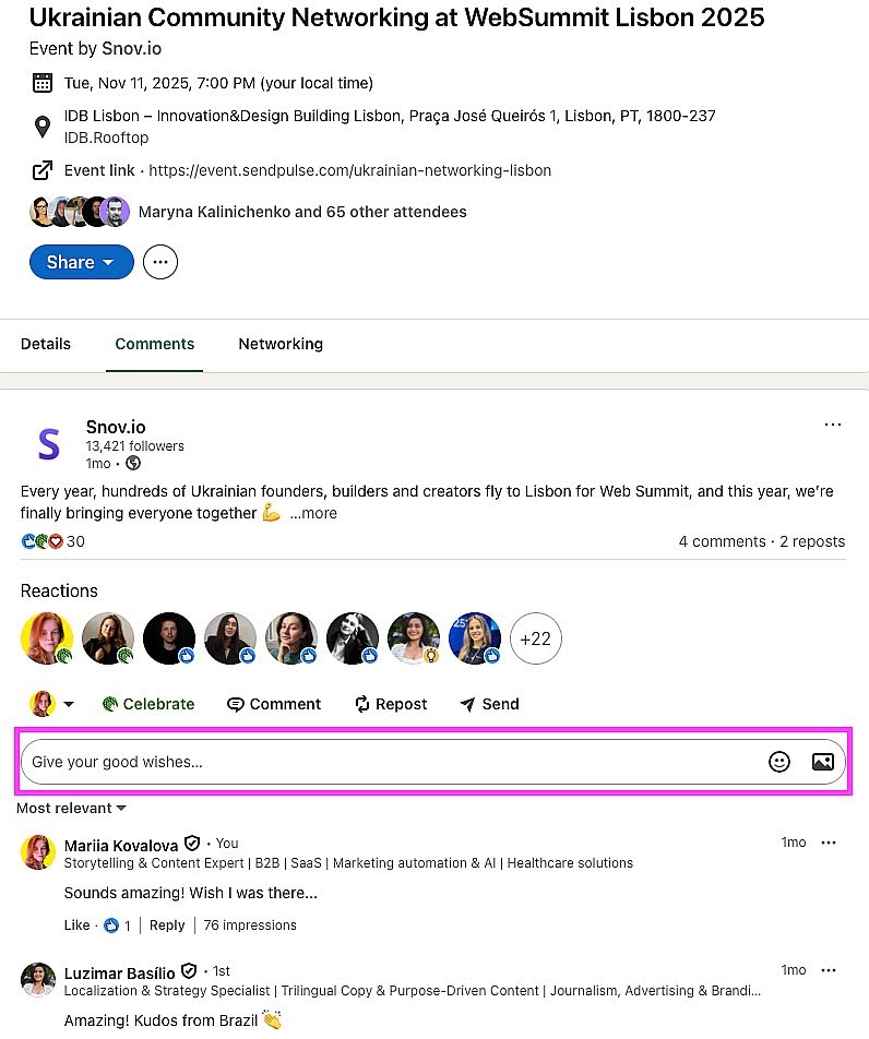 Another trick many people don’t know is that you can utilize LinkedIn event groups to connect with other attendees before and after the event. How? LinkedIn events have a comment section where event organizers and attendees can communicate.