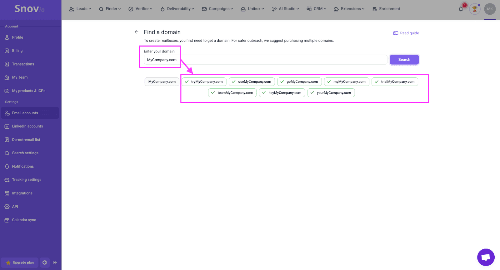 Manual cold email domain setup sounds like a headache? If you want to save time and effort, try option number two: Snov.io’s Done-For-You (DFY) mailbox setup. This feature delivers verified domains and mailboxes automatically, so you can start outreach faster without risking deliverability errors.