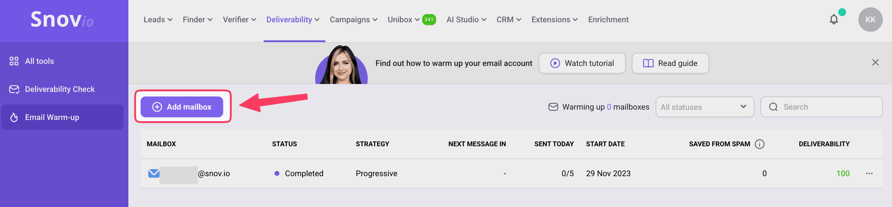 The fastest and most reliable way to get your new mailboxes ready for launching a campaign is to use dedicated software. Today, one of the best solutions on the market is Snov.io’s Email Warm-up Tool, which may help you run the process with minimum effort.