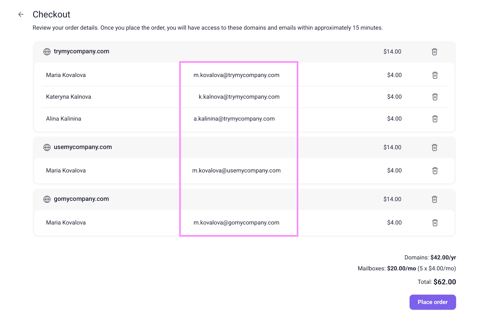 Note that you only pay for each domain once a year, while mailboxes cost $ 4/month per mailbox.