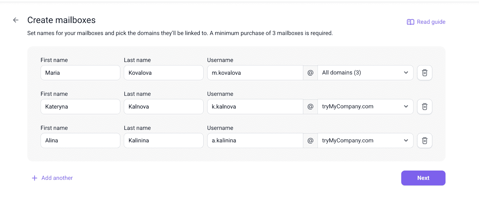 I recommend having at least 2-3 domains, with 3-5 mailboxes per domain. The minimum purchase is 3 mailboxes, but the exact number depends on your sending volume. Consider that the optimal sending volume per mailbox is 20-30 emails per day, while sending more than 50 emails per day is considered risky.