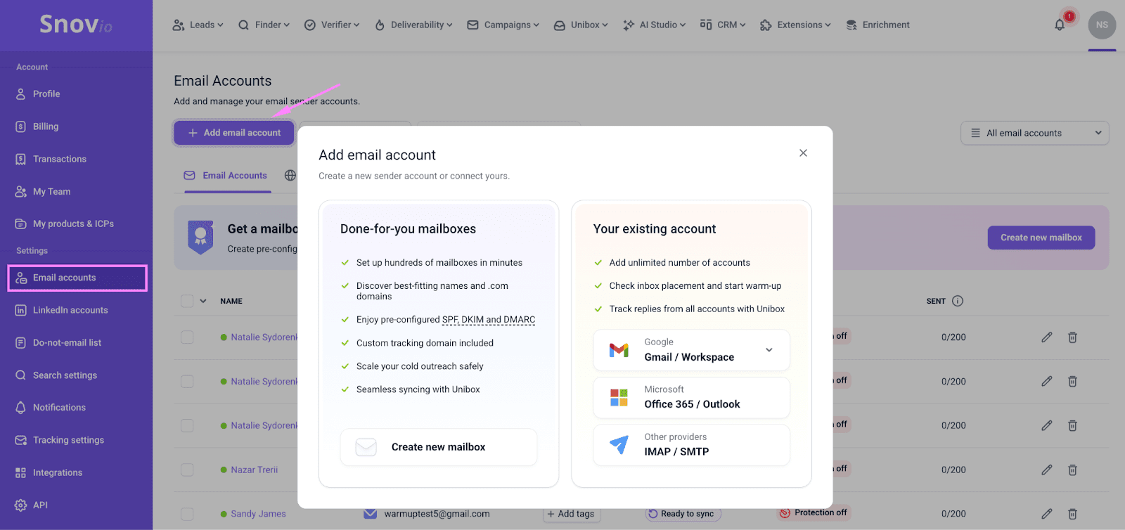 Manual setup gives you full control and technical transparency, but it takes time, skill, and precision. Snov.io’s done-for-you mailbox setup for outreach automates the entire process, letting you focus on messaging and sales instead of DNS settings.
