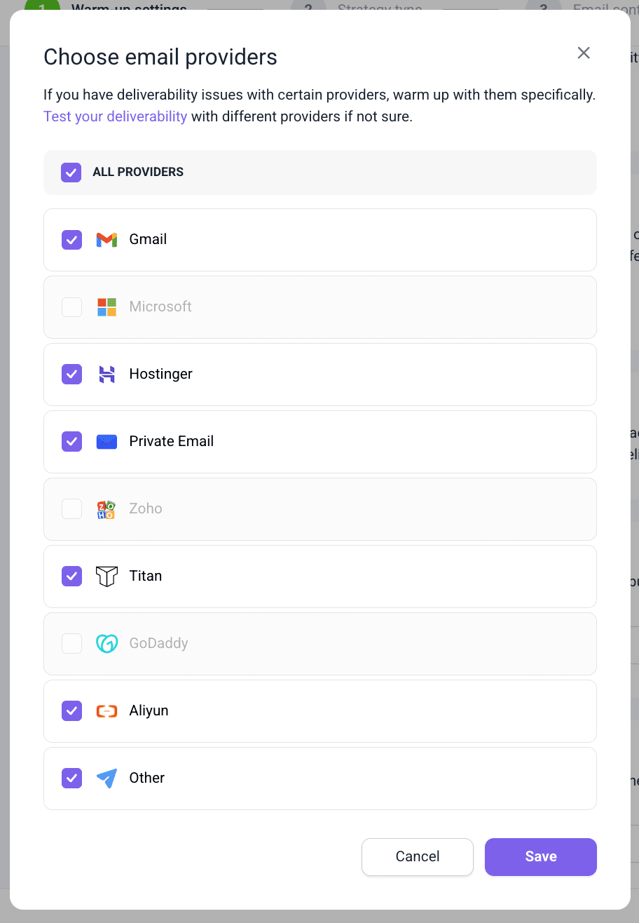 If your prospect base is concentrated within a specific email ecosystem (e.g., Outlook or Yahoo), the smart thing to do is to target your warm-up to these providers. You can do this by choosing the particular providers during this step.