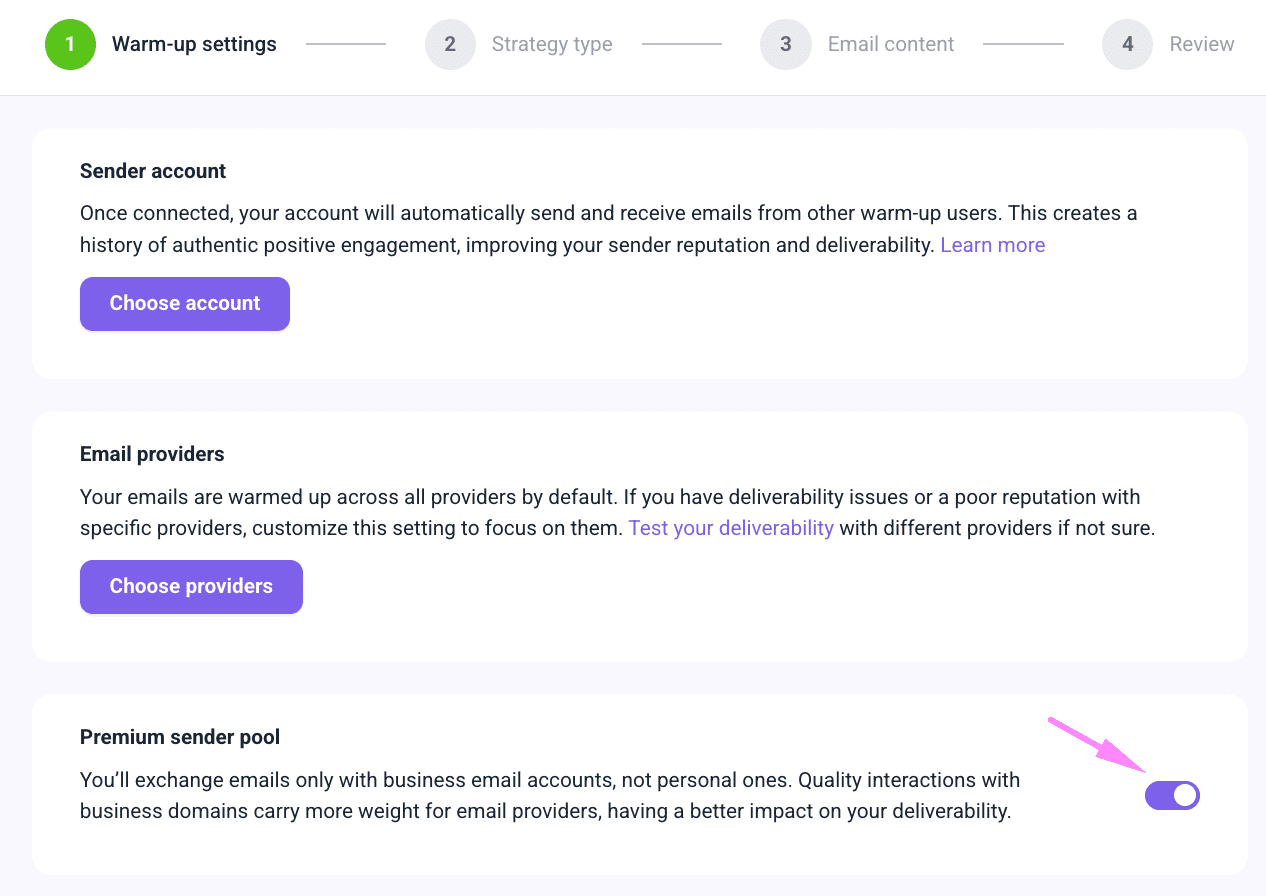 Also, by default, your account will be warmed up together with other accounts on free domains. To signal more credibility and warm up the business account more effectively, select the “Premium warm-up pool” option.