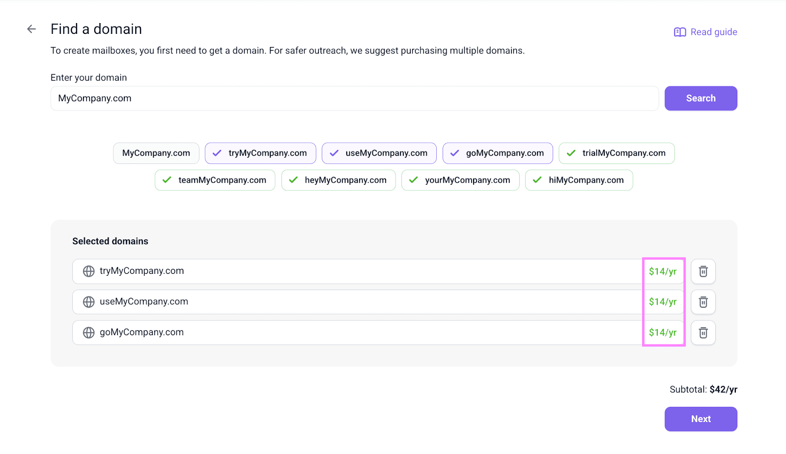 Luckily, nowadays you can purchase a separate domain for your cold email infrastructure that sounds very similar to your main domain. For example, if your main domain is company.com, use getcompany.com or company-outreach.com for outreach needs.