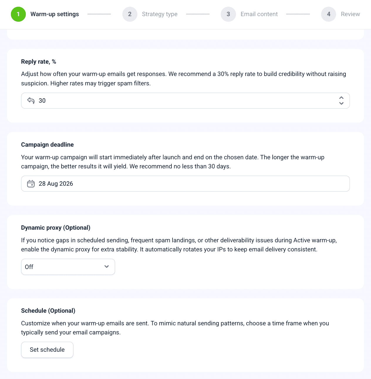 💡Pro-tip: If you’re warming up multiple mailboxes at once, sending across regions, or dealing with strict providers (e.g., Outlook or corporate filters) – turn on dynamic proxy. Dynamic proxies rotate IPs and locations for your warm-up traffic, so it looks more organic and human-like.