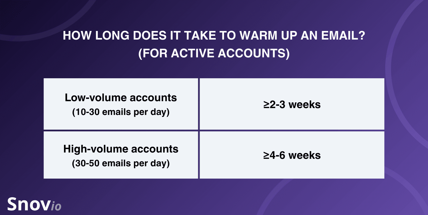 Your planned sending volume also matters in this case. For active accounts with low-volume outreach (10-30 emails per day), warm up for 2-3 weeks. For higher volumes of 30-50 emails per day, extend the warm-up to 4-6 weeks or longer.